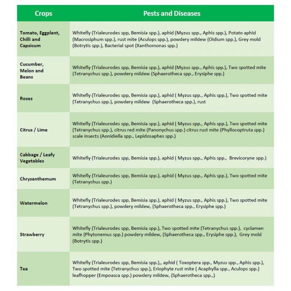 HarvestGuard™ has a broad-spectrum control on both pests and diseases, we have economic control over whiteflies, mites, (including rust mite and cyclamen mite), aphids, scale insects, powdery mildew, fungus rust and black spot.